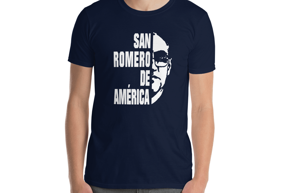 Parte delantera de Camiseta azul negro manga corta unisex con diseño y frase de San Romero de América – Amejoartes – Jorge A. Merino – El Salvador Oct 12, 2021