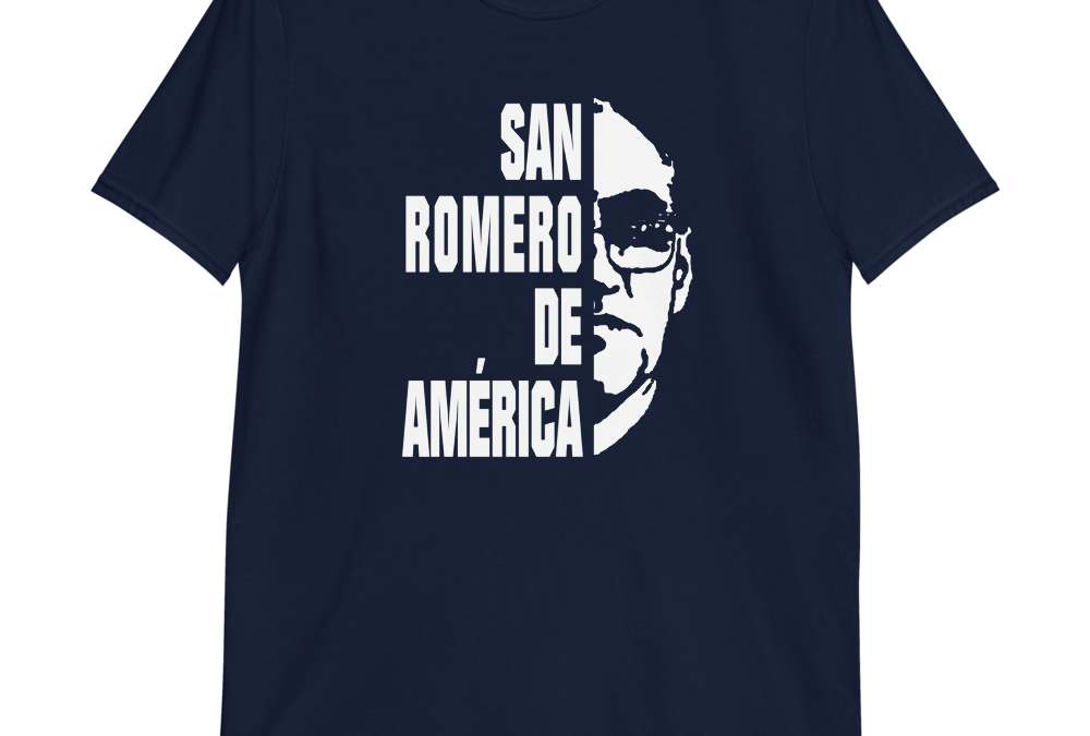 Parte delantera de Camiseta azul negro manga corta unisex con diseño y frase de San Romero de América – Amejoartes – Jorge A. Merino – El Salvador Oct 12, 2021