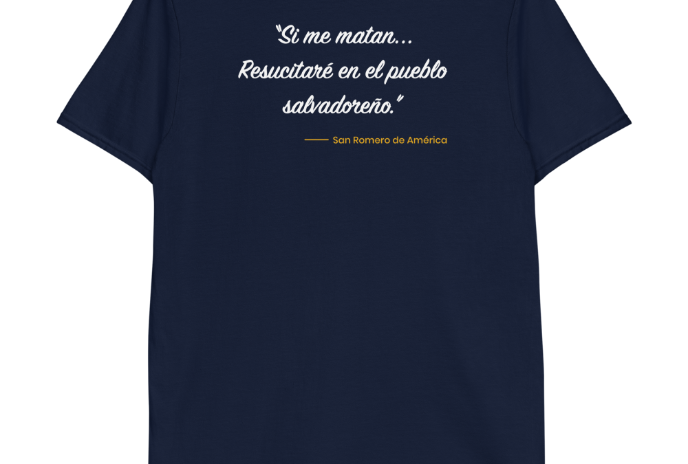 Parte trasera de Camiseta azul negro manga corta unisex con diseño y frase de San Romero de América – Amejoartes – Jorge A. Merino – El Salvador Oct 12, 2021