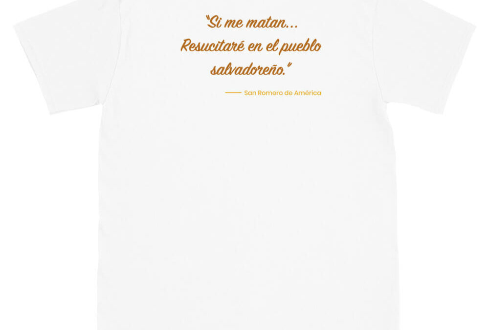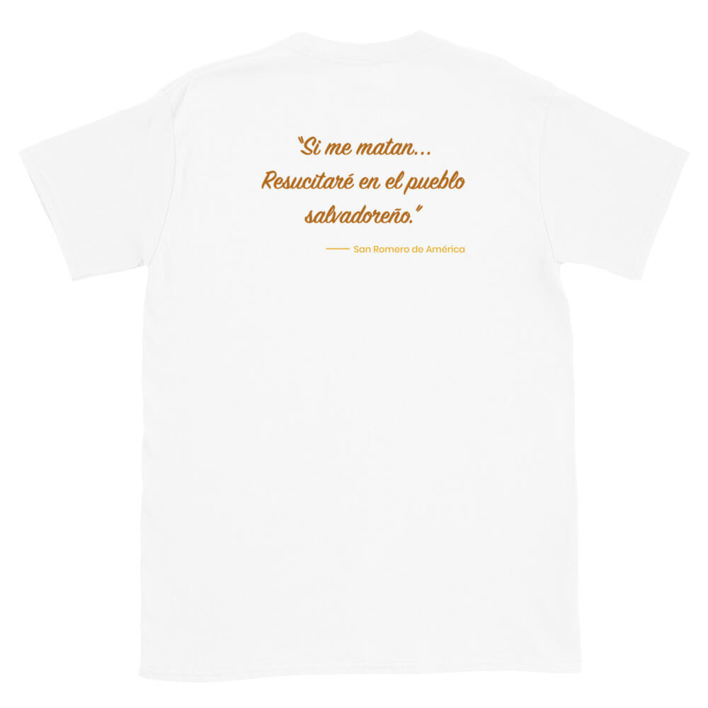 Parte trasera de Camiseta blanca manga corta unisex con diseño y frase de San Romero de América – Amejoartes – Jorge A. Merino – El Salvador Oct 13, 2021