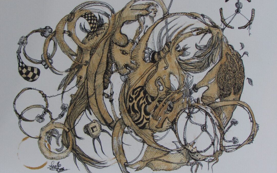 La rueda – Serie cafeína – VIDRIO PEQ. – 8.5 x 11 pulgadas – Café espresso y tinta sobre papel – 2016 – Jorge A. Merino – AMEJOARTES Dic 6, 2024